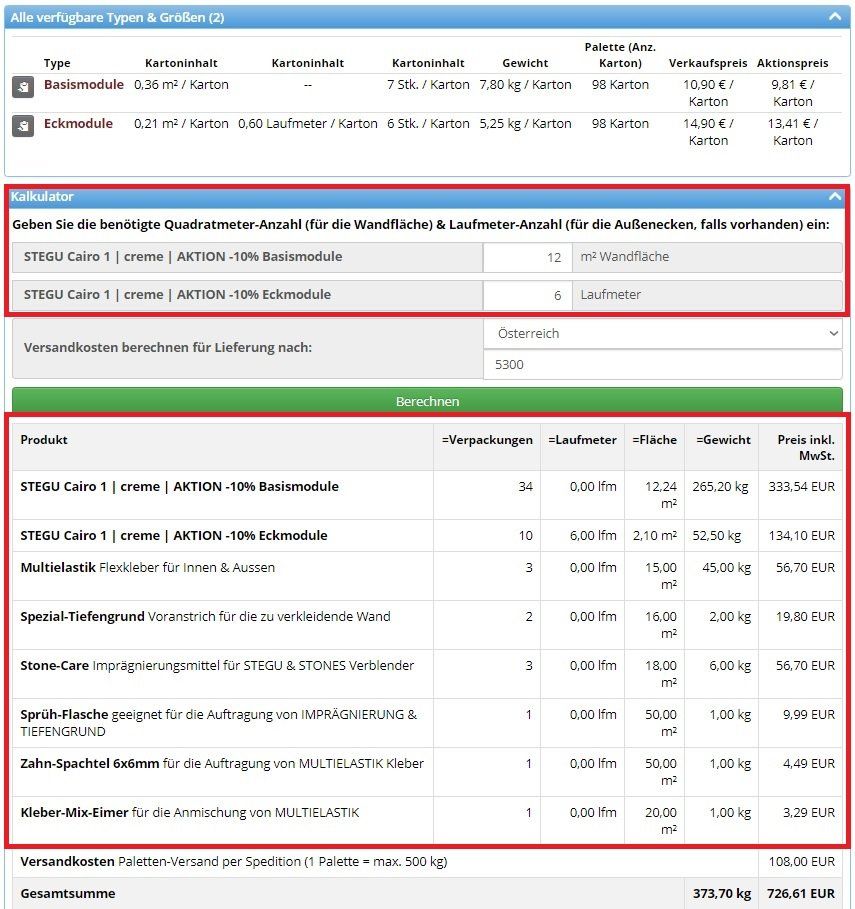 Als Beispiel eine Kalkulation für 12m² Wandfläche und 6 Laufmeter(vertikale lfm) Eckmodule: